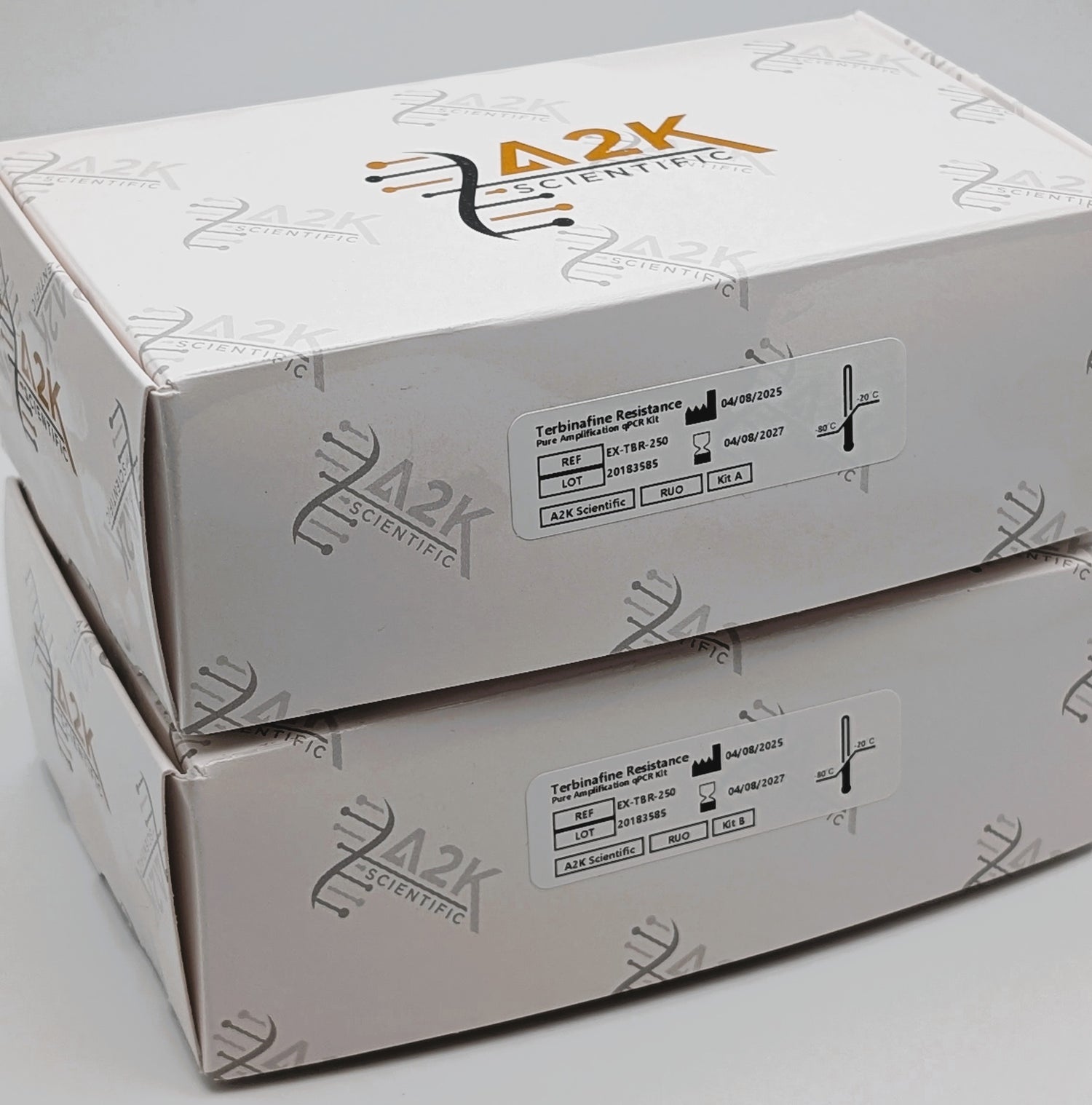 The A2K Terbinafine Antifungal Resistance Detection qPCR kit is designed to quickly and accurately detect point mutations in the SQLE gene of Trichophyton species associated with Terbinafine antifungal resistance. This kit enables the detection of 12 point mutations that cause amino acid substitutions resulting in increased minimum inhibitory concentrations for the antifungal Terbinafine.